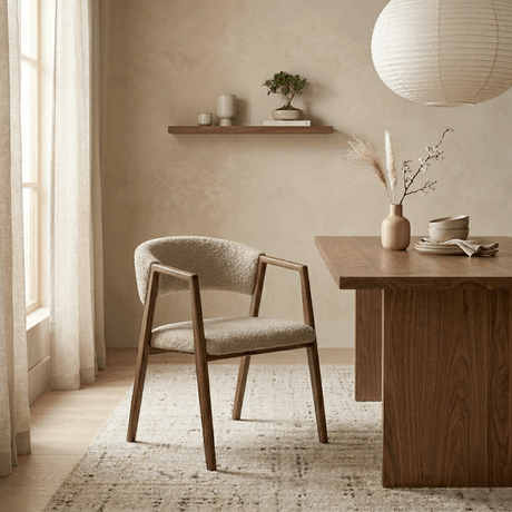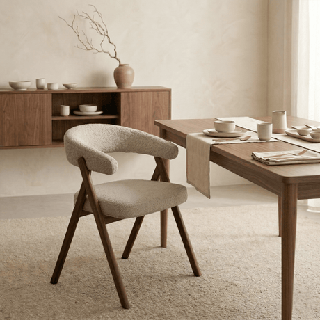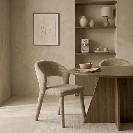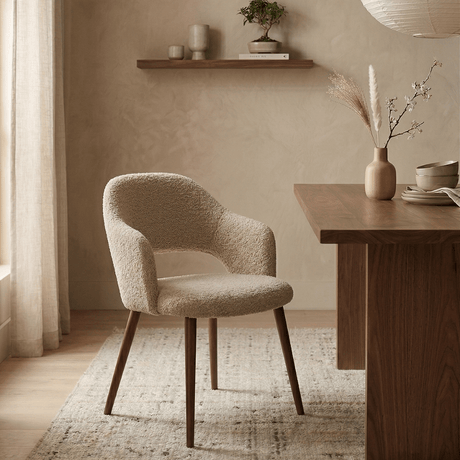950,881.307,90Grundpreis /Nicht verfügbarJapandi Esszimmerstuhl Sandfarbe Bouclé Suki - Walnussrahmen - Mit Armlehne