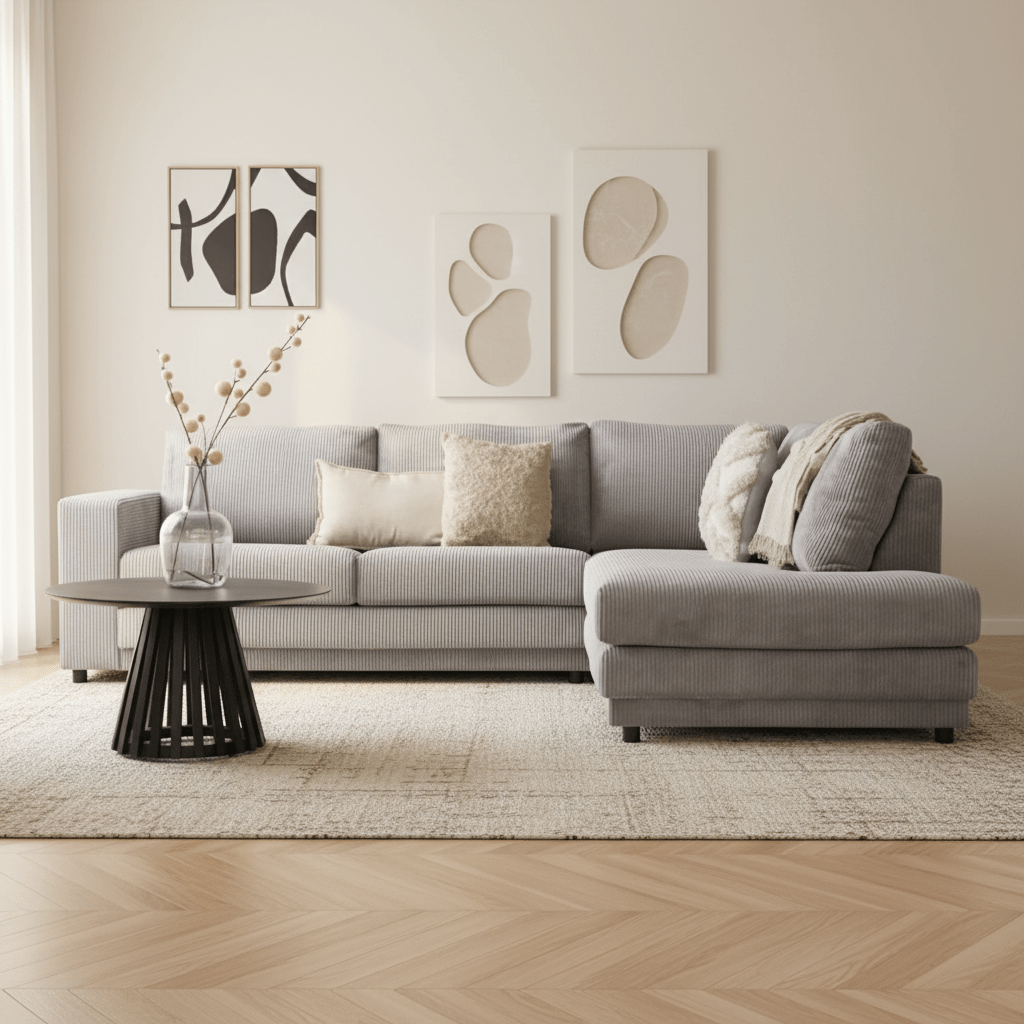 Das moderne Ecksofa Gabi ist aus Cordstoff gefertigt und hat Metallfüße. Dieses verschleißfeste Ecksofa bietet dank der breiten und weichen Kissen einen komfortablen Sitz. Möchten Sie sich nach einem langen Arbeitstag bequem entspannen? Wählen Sie das Ecksofa Gabi!