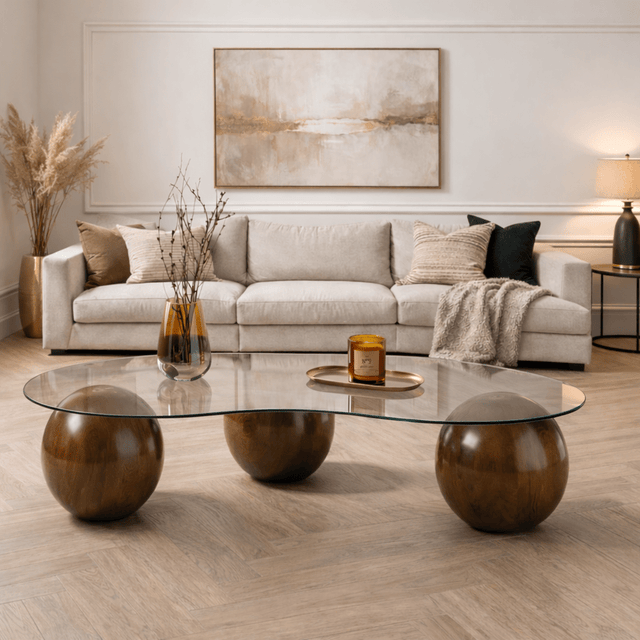 Mit den Maßen von 120 cm Länge, 70 cm Breite und 30 cm Höhe bietet dieser Couchtisch ausreichend Platz für Kaffee, Zeitschriften und dekorative Gegenstände, während die Höhe von 30 cm eine bequeme Sitzhaltung bewahrt. Dank des schlanken Designs entsteht Leichtigkeit in jedem Raum und er passt mühelos neben ein Sofa oder in eine offene Sitzecke. Die Kombination aus Glas und Holz verleiht eine zeitlose Ausstrahlung, die mit Ihrem Wohnstil wächst.