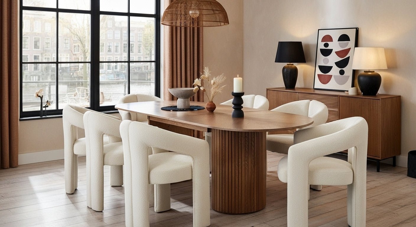 Bouclé, ein langlebiger und luxuriöser Stoff mit weicher Textur und Schlingen, verleiht Möbeln Komfort und Stil und sorgt so für einen warmen und schicken Look in jedem Interieur.