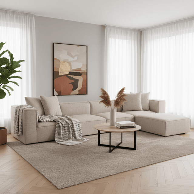 Mit seinem schlanken und zeitgenössischen Design passt unser Ecksofa mühelos zu jedem Einrichtungsstil. Die sandbeige Farbe verleiht Ihrem Wohnraum einen Hauch von Raffinesse, während der 100% Leinenstoff ein Gefühl von Luxus ausstrahlt. Die klaren Linien und das moderne Silhouette machen dieses Sofa zu einem Prunkstück, das die gesamte Ästhetik Ihres Hauses verbessern wird.