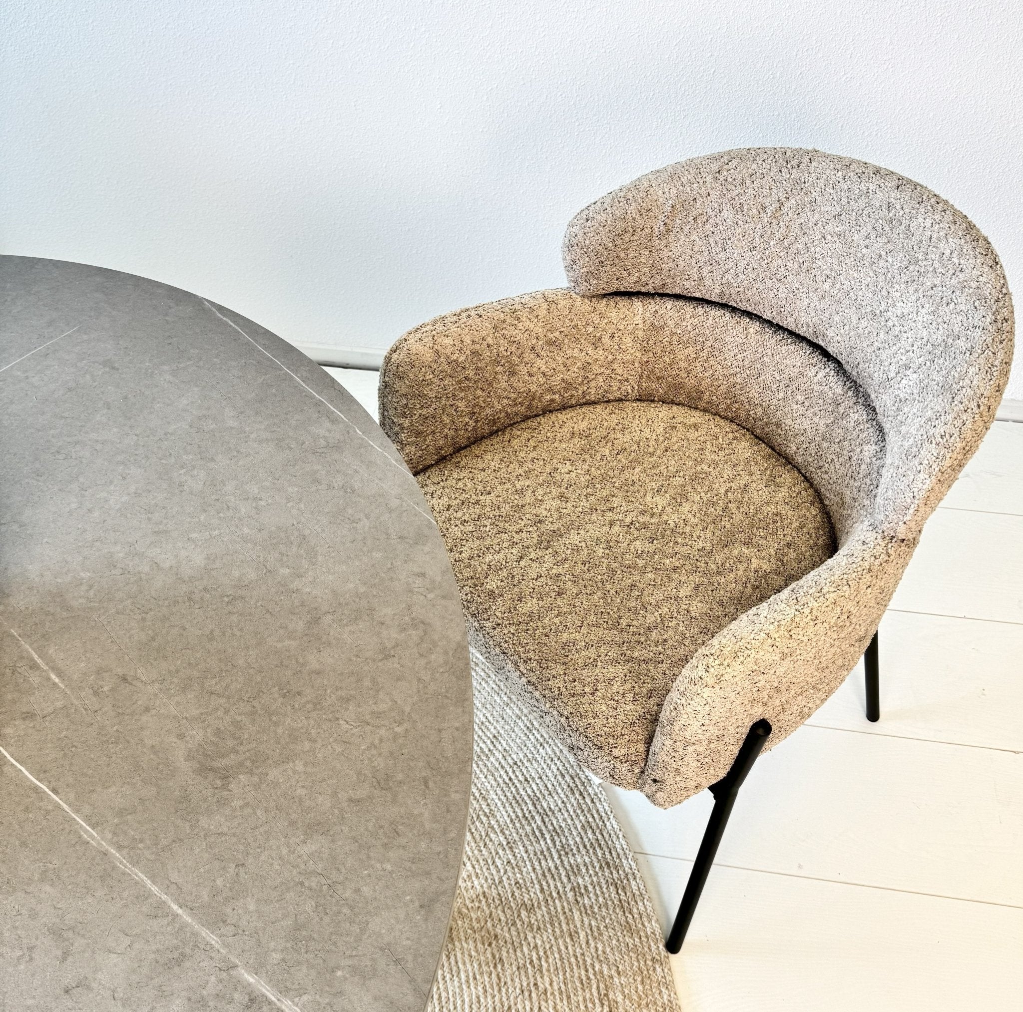 Esszimmerstuhl Lola Bouclé Stoff Beige mit rundem Rücken und Arm