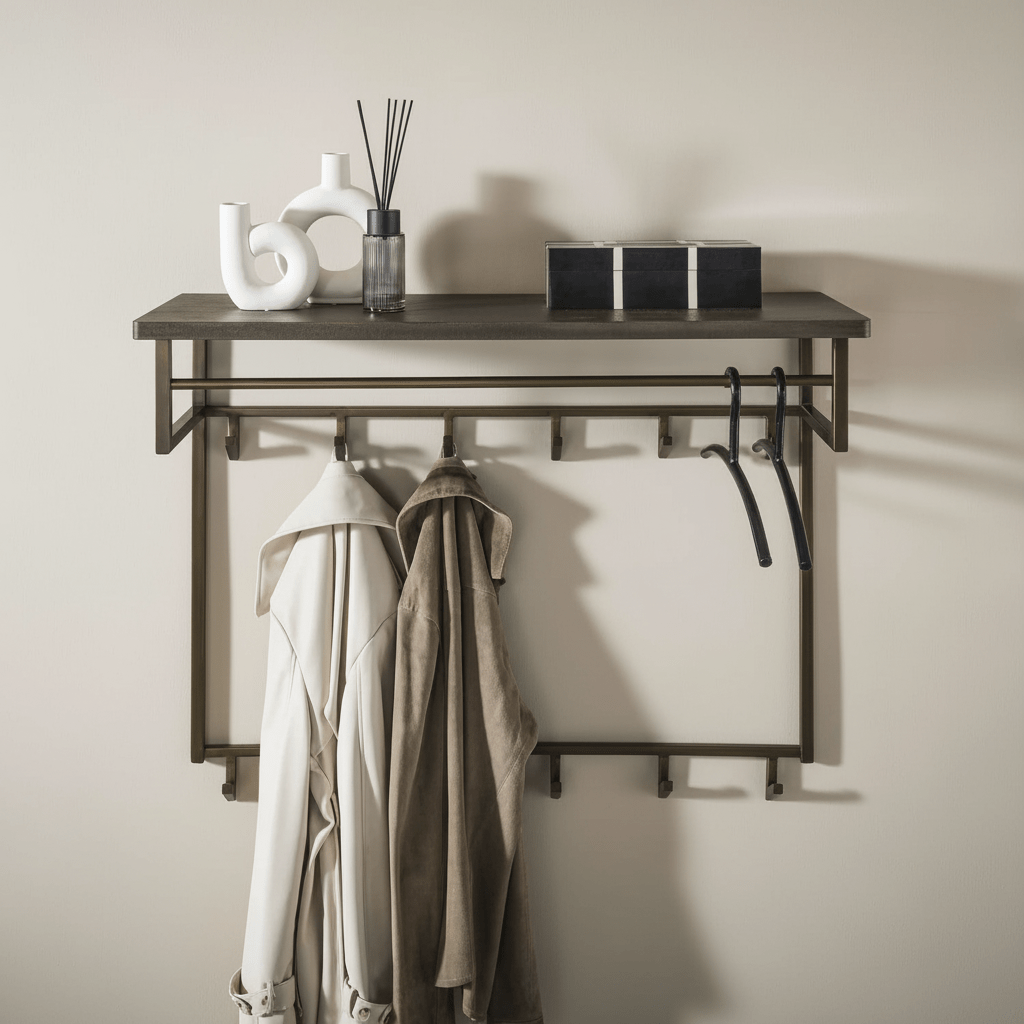 Mit 12 Haken und einer praktischen Stange + Hutablage, beide in elegantem Messing-Antik-Finish, bietet die Ferre-Garderobe viel Platz für Mäntel, Taschen und Accessoires. Egal, ob Sie ein minimalistisches Interieur oder einen eher klassischen Stil bevorzugen, Ferre verleiht immer einen Hauch von Eleganz.