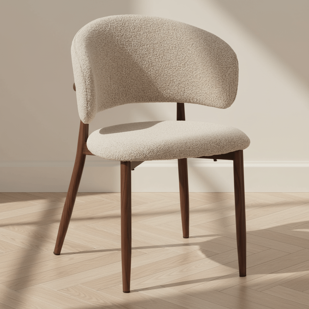 Der Esstischstuhl Yuka ist mit einem luxuriösen Bouclé-Stoff bezogen, der für seine warme, wollige Optik und seine weiche Struktur bekannt ist. Die Beine sind aus Metall gefertigt und mit einer realistischen Walnuss-Holzoptik versehen, was dem Stuhl die perfekte Balance zwischen Stil und Stabilität verleiht. Die Kombination aus weichem Stoff und natürlichen Tönen sorgt für einen zeitlosen Look.