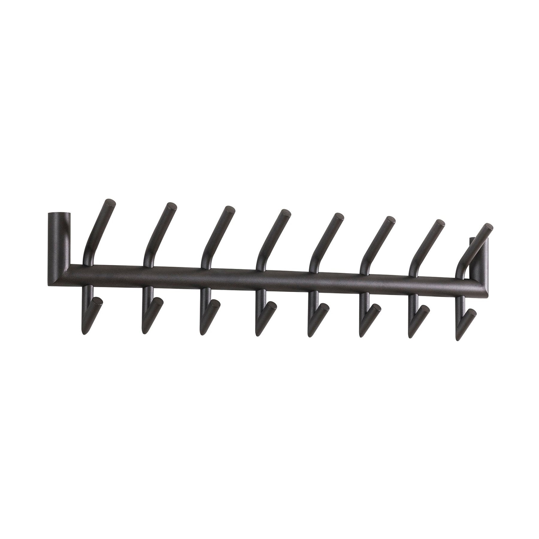 Met twee rijen haken creëer je overzicht: jassen boven, tassen en sjaals onder, of juist voor ieder gezinslid een eigen plek. De matte donkergrijze afwerking geeft een stoere, tijdloze look die moeiteloos past bij industriële, moderne en minimalistische interieurs. Dankzij het compacte ontwerp blijft er genoeg loopruimte over, zelfs in een smallere gang.