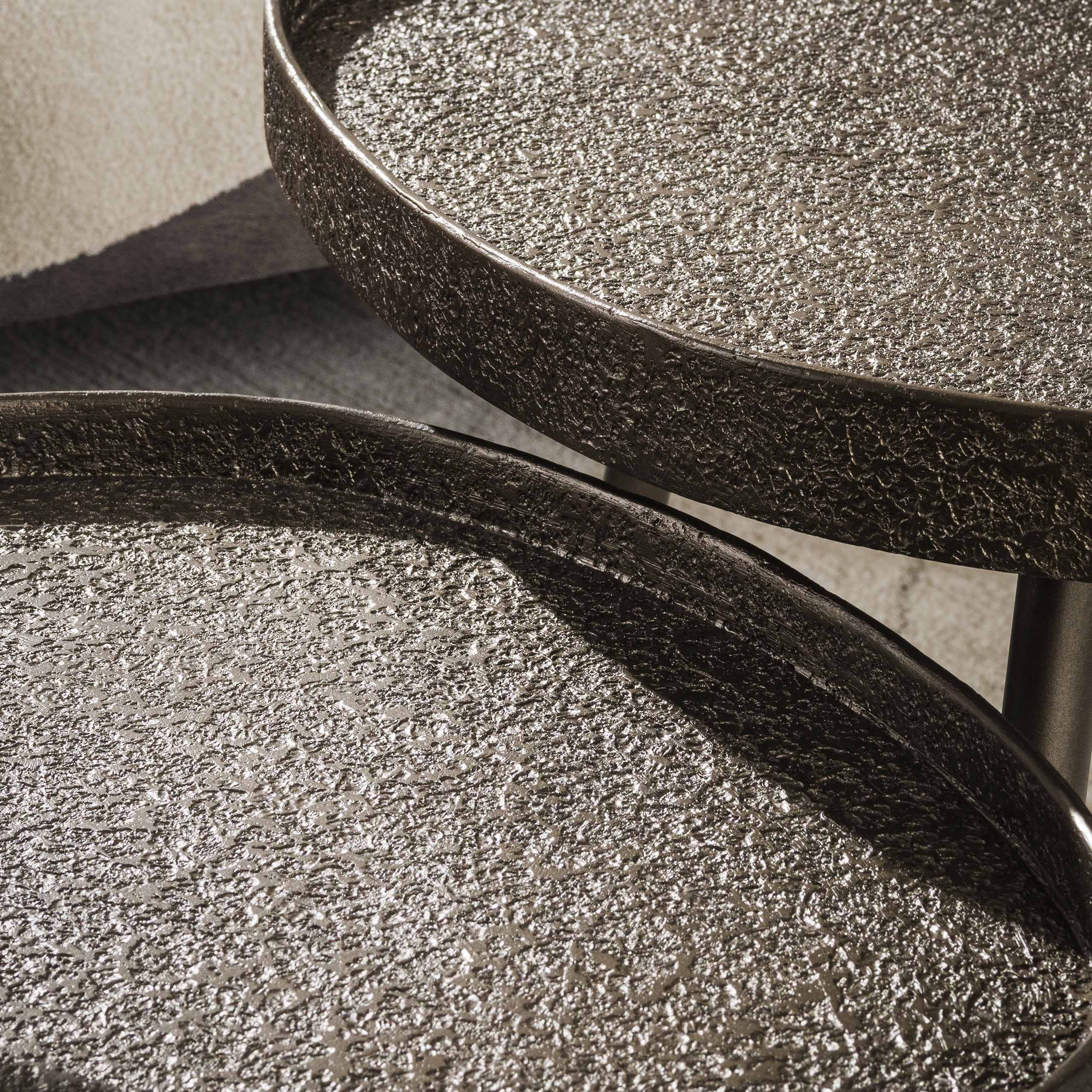 Das Luna Triangle Couchtisch-Set mit 2 Tischen verleiht deinem Wohnzimmer eine auffällige, skulpturale Note. Dieses Set besteht aus zwei dreieckigen Beistelltischen aus Bronze Liquid Metal mit einer feinen, leicht reflektierenden Oberfläche. Das Design legt Wert auf Funktion und Ästhetik: Durch die dreieckige Silhouette passen die Tische sowohl einzeln als auch kombiniert zu modernen und industriellen Interieurs.