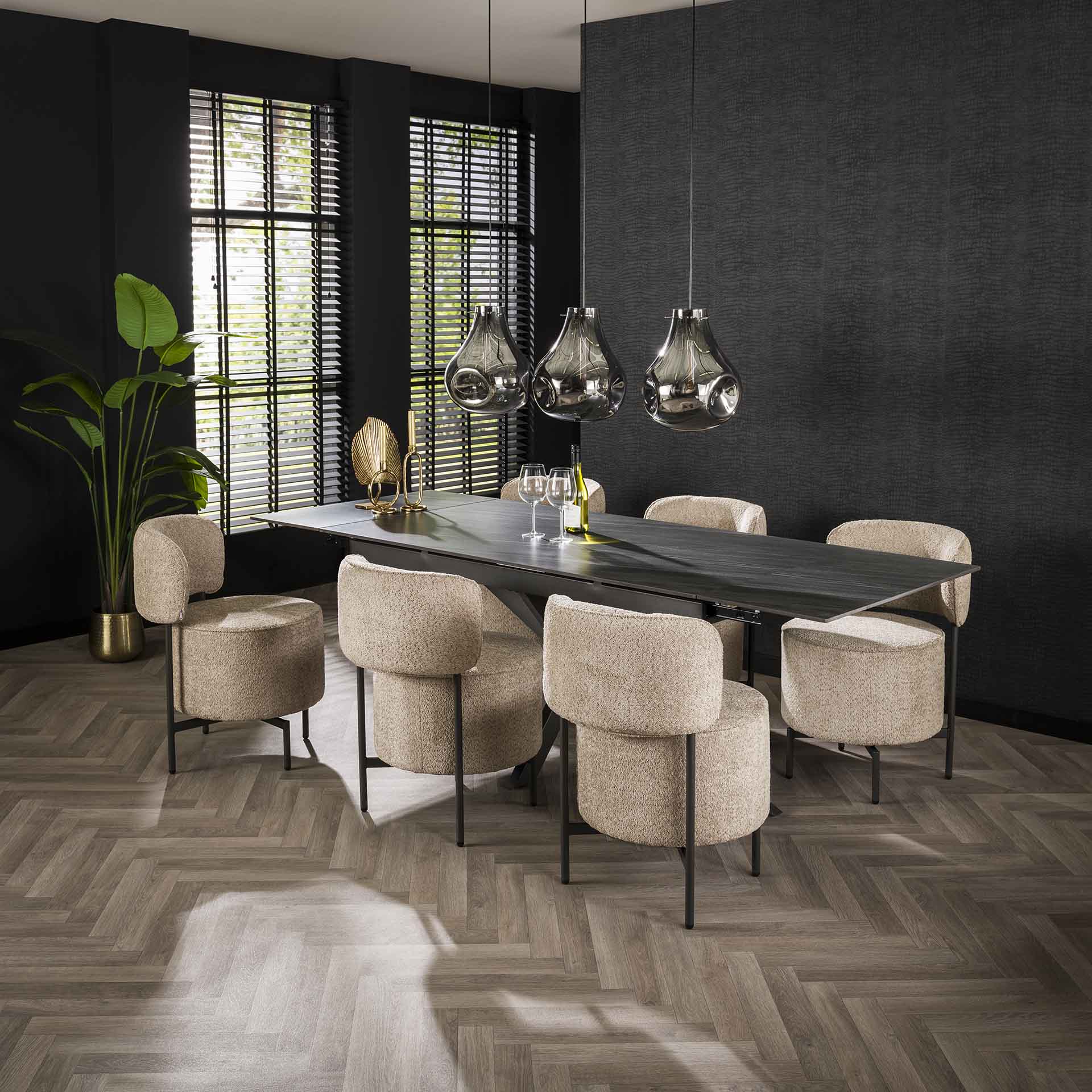 Die Dante Bouclé-Esszimmerstühle kombinieren Komfort mit einem aktuellen Aussehen. Durch die neutrale Sandfarbe passen sie in viele Farbpaletten und Einrichtungsstile. Ideal als Set für Menschen, die eine warme, gemütliche Atmosphäre am Tisch suchen, ohne auf Funktionalität zu verzichten.