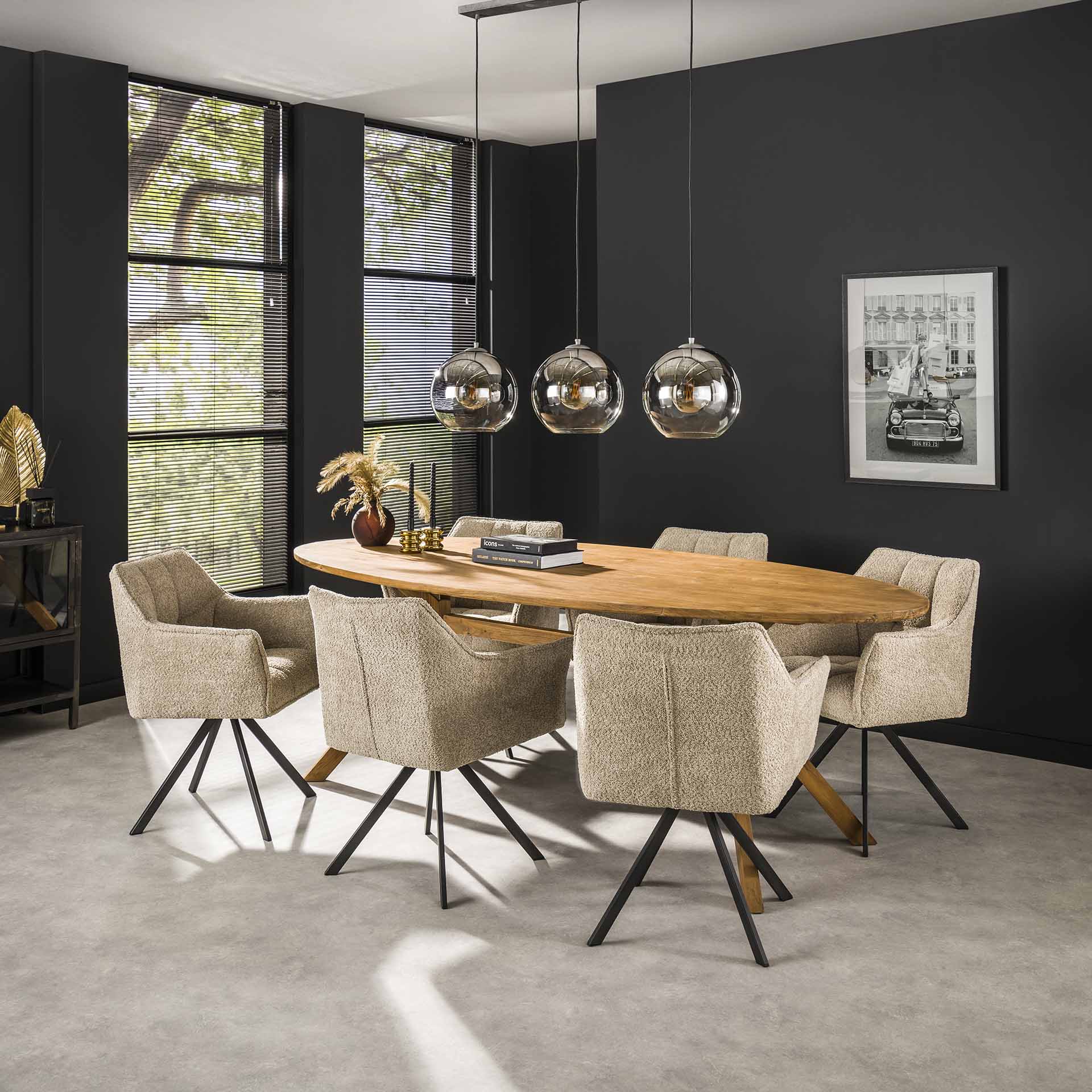 Dieses Set von 2 Esszimmerstühlen Lino in Bouclé-Stoff bietet eine stimmungsvolle und komfortable Sitzlösung für moderne Innenräume. Die warme Sandfarbe und die weiche Bouclé-Faser verleihen ein luxuriöses, einladendes Aussehen, während das drehbare Untergestell Benutzerfreundlichkeit beim Sitzen und Aufstehen hinzufügt. Ideal für Esszimmer, offene Küchen und Arbeitsplätze, wo Komfort und Ausstrahlung Hand in Hand gehen.